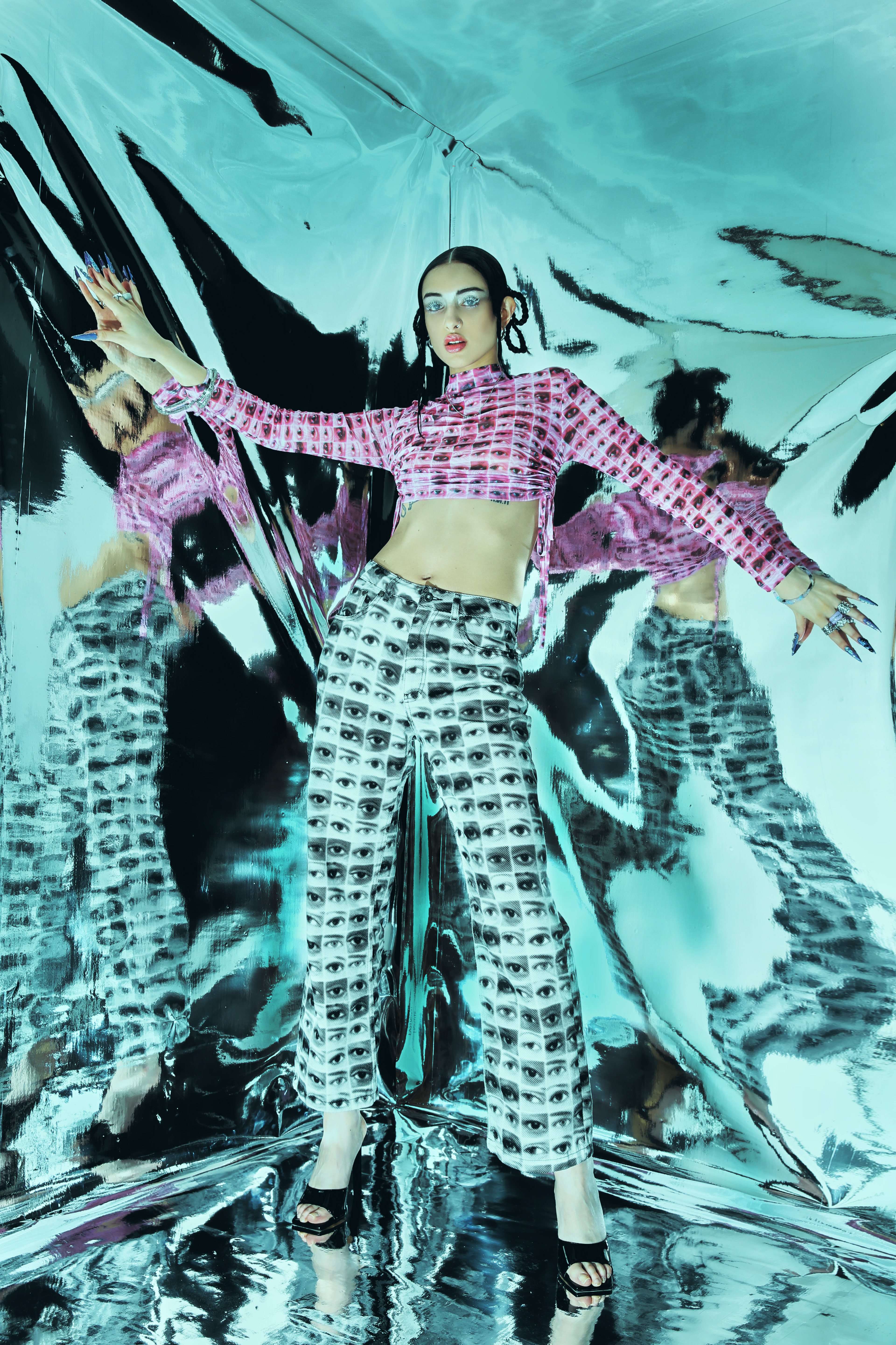 Playing with light and refraction, otherworldly and psychedelic scenes are creates to complement the graphic grunge-inspired garments.
